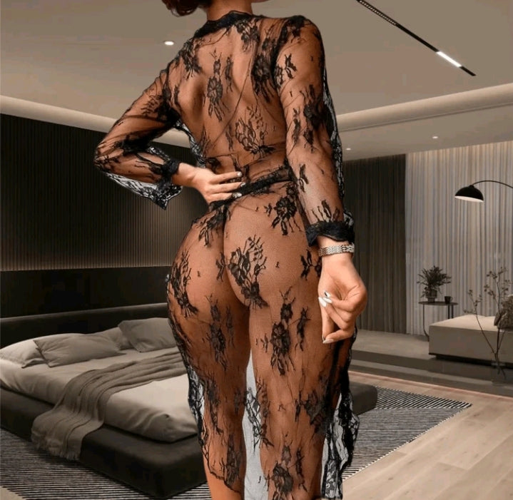 Lace Mesh Lingerie Robe (Thong Included)