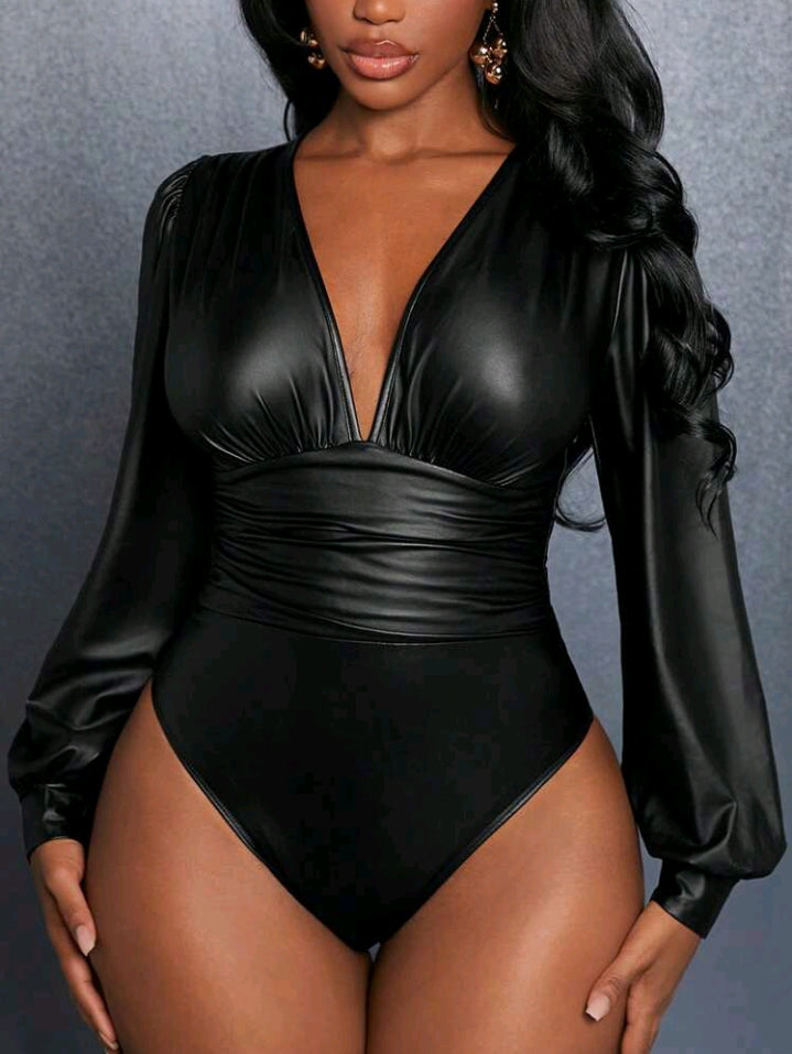 Plunging Neckline Lantern Sleeved Ruched Leather Bodysuit
